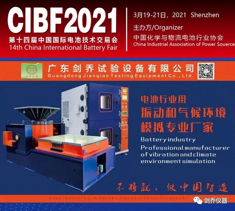 2021年3月19-21日,廣東劍喬試驗(yàn)設(shè)備有限公司【劍喬儀器】將攜旗下最新試驗(yàn)設(shè)備亮相2021年的第一場(chǎng)展會(huì)—(CIBF2021)“第十四屆中國國際電池技術(shù)交流會(huì)/展覽會(huì)”。現(xiàn)場(chǎng)展示:振動(dòng)試驗(yàn)系統(tǒng)、溫濕度振動(dòng)三綜合箱、電池?zé)釣E用試驗(yàn)箱、電池短路試驗(yàn)箱、高加速?zèng)_擊試驗(yàn)臺(tái)、高低溫防爆試驗(yàn)箱、等試驗(yàn)設(shè)備及動(dòng)力電池相關(guān)試驗(yàn)解決方案。